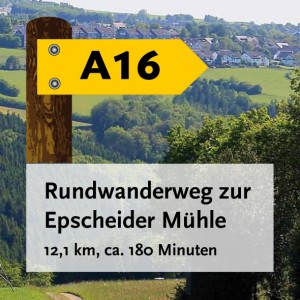 Ab Wanderparkplatz „Schul und Sportzentrum“ den Weg hinter der Wandertafel talwärts A11 - A16 - A 17, ab der zweiten Bank hinter der einzelnen Eiche rechts ab zur Epscheider Mühle. Weiter ins enge Bachtal der „Sauren Epscheid“ über eine neue Metallbrücke bis zum Haus „Reckhammer“. Kurz entlang der L701 nach rechts bis zum Ortsteil Klippe. Ab hier endlos bergauf zu den Kalthauser Höhen mit herrlichem Panoramablick. Links weiter kurz die Asphaltstraße und wieder abwärts in´s Tal des Kalthauser Baches zum „Schemm“.